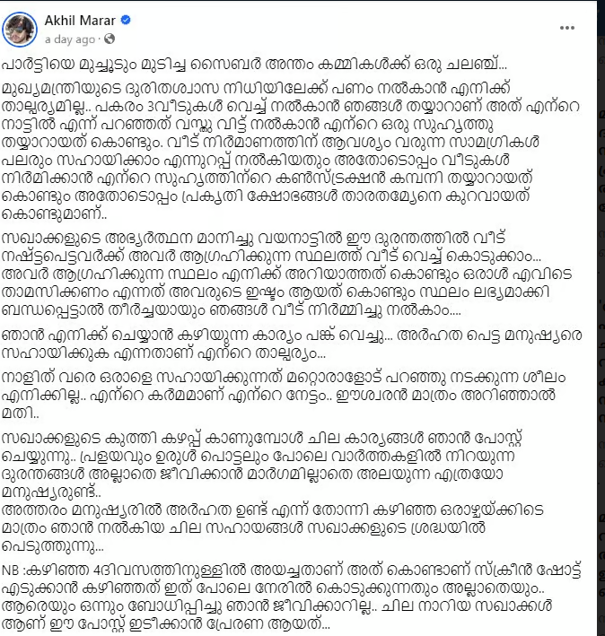 വയനാട് ദുരന്തത്തില്പ്പെട്ടവരെ സഹായിക്കാന് മുഖ്യമന്ത്രിയുടെ ദുരിതാശ്വാസനിധി യിലേക്കു പണം കൊടുക്കാന് താല്പ്പര്യമില്ലെന്നായിരുന്നു അഖിലിന്റെ ഫെയ് സ്ബുക്ക് പോസ്റ്റ്. പകരം താന് വീടുകള് വച്ചു നല്കുമെന്നും അഖില് പറഞ്ഞിരുന്നു. കേസെടുത്തതിനു പിന്നാലെ ‘വീണ്ടും കേസ്, മഹാരാജാവ് നീണാള് വാഴട്ടെ’ എന്ന കുറിപ്പും പുതിയതായി പോസ്റ്റും അഖില് മാരാര് ഫെയ്സ്ബുക്ക് അക്കൗണ്ടില് ഇട്ടിട്ടുണ്ട്.