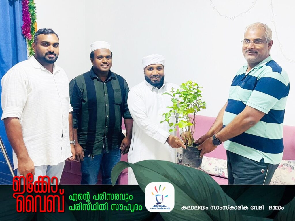 ദമ്മാം : ലോക പരിസ്ഥിതി ദിനാചാരണത്തിന്റെ ഭാഗമായി കലാലയം സാംസ്കാരിക വേദി ഗ്ലോബൽ കമ്മിറ്റി വിവിധ രാജ്യങ്ങളിൽ 5000 കേന്ദ്രങ്ങളിൽ സംഘടിപ്പിക്കുന്ന ‘ഇക്കോ വൈബ് ‘എന്ന പദ്ധതിയുടെ ദമ്മാം സോൺ തല ഉദ്ഘാടനം ഐ. സി. എഫ് ഇന്റർനാഷണൽ സെക്രട്ടറി സലീം പാലചിറക്ക് വൃക്ഷ തൈ നൽകി നിർവഹിച്ചു. രിസാല സ്റ്റഡി സർക്കിൾ ദമ്മാം സോൺ ചെയർമാൻ സയ്യിദ് സഫ്വാൻ തങ്ങൾ ജനറൽ സെക്രട്ടറി ജിഷാദ് ജാഫർ തുടങ്ങിയവർ ചേർന്ന് വൃക്ഷതൈ കൈമാറി.
