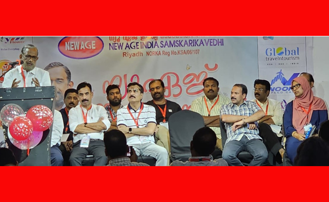 ന്യൂ എയ്ജ് ഇന്ത്യ സാംസ്കാരികവേദി റിയാദിൽ സംഘടിപ്പിച്ച സൗഹൃദസന്ധ്യ എന്ന പരിപാടി ഉത്ഘാടനം ചെയ്ത് സംസാരിക്കുകയായിരുന്നു അദ്ദേഹം. വിനോദ് കൃഷ്ണ അധ്യക്ഷത വഹിച്ച സാംസ്കാരിക സമ്മേളനം പ്രശസ്ത എഴുത്തുകാരനും, കലാ കുവൈറ്റ് ഈ വർഷം ഏർപ്പെടുത്തിയ എം. ടി. സാഹിത്യ പുരസ്കാരം അവാർഡ് ജേതാവ് ശ്രീ. ജോസഫ് അതിരുങ്കലിനെ ആദരിച്ചു. ചടങ്ങിൽ സുരേന്ദ്രൻ കൂട്ടായി (കേളി), സലിം കൊളക്കറ (OICC), സുധീർ കുമ്മിൾ (നവോദയ), ശിഹാബ് കൊട്ടുകാട്, ജയൻ കൊടുങ്ങല്ലൂർ (മീഡിയ ), നിബു വർഗീസ് (റിഫ), സബീന എം സാലി (യുവകലാ സാഹിതി), റഹ്മാൻ മുനമ്പത്ത് (ഫോർക), നൗഷാദ്(സിറ്റി ഫ്ലവർ ) മുഹമ്മദ് ഖാൻ(എൻ.എം.സി.ഇ. ലോജിസ്റ്റിക്) എന്നിവർ ആശംസകൾ നേർന്നു.