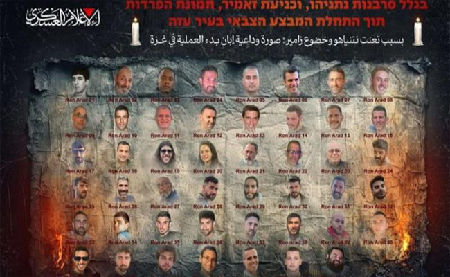 ഗാസ സിറ്റി: തടവിലാക്കപ്പെട്ട ഇസ്രയേലി ബന്ദികളുടെ വിടവാങ്ങൽ ചിത്രം പുറത്തുവിട്ട് ഹമാസിൻ്റെ സായുധസേനാ വിഭാഗം. തടവിലാക്കപ്പെട്ട 47 ഇസ്രയേലി ബന്ദികളുടെ ചിത്രമാണ് പുറത്തുവിട്ടത്. ഗാസയിൽ ഇസ്രയേൽ സൈന്യത്തിൻ്റെ ആക്രമണം ശക്തമാകുന്നതിനിടയ്ക്കാണ് ഹമാസ് ഇത്തരത്തി ലൊരു നീക്കം നടത്തിയത്. ഇസ്രയേലിൻ്റെ ആക്രമണങ്ങൾ ശക്തമാക്കുന്നത് തടവുകാരുടെ ജീവൻ അപകടത്തിലാക്കുമെന്ന് ഹമാസ് നിരന്തരം മുന്നറിയിപ്പ് നൽകിയിട്ടുണ്ട്. തടവിലാക്കപ്പെട്ടവരിൽ ചിലർ കൊല്ലപ്പെട്ടെന്നും റിപ്പോർട്ടുണ്ട്.