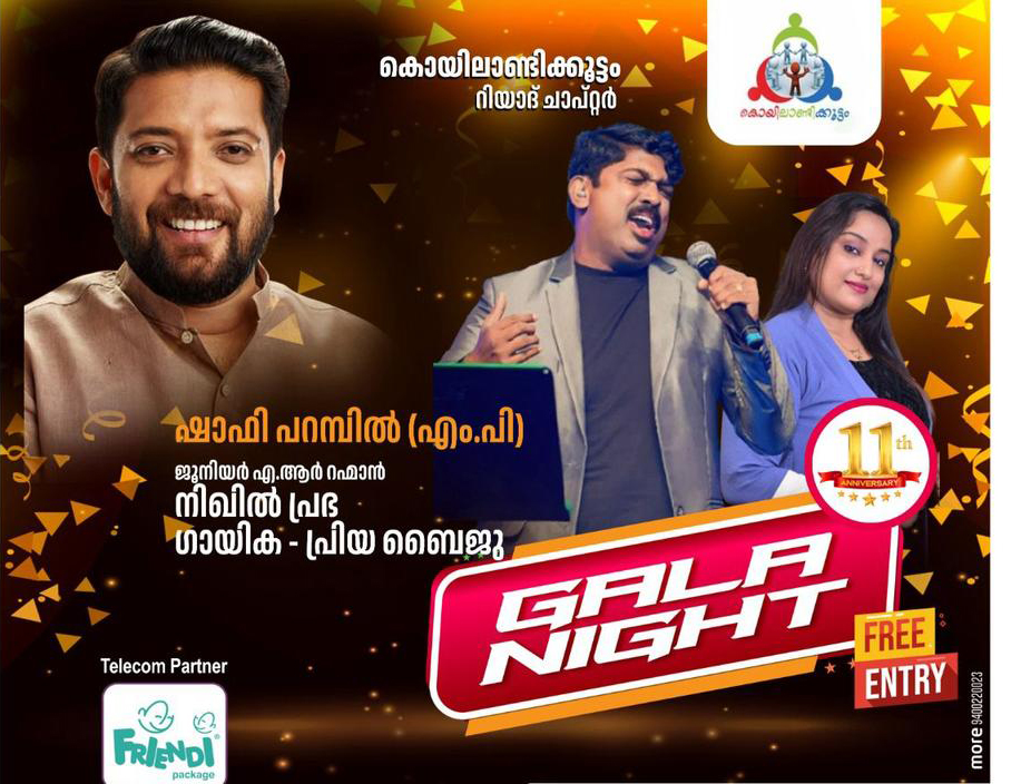 നാട്ടിൽ നിന്നും വരുന്ന പ്രശസ്ത ഗായകൻ നിഖിൽ പ്രഭ , ഗായിക പ്രിയ ബൈജു എന്നിവർ ഗാല നൈറ്റ് സംഗീത വിരുന്ന് റിയാദ് പ്രവാസികൾക്ക് ഒരു ഉത്സവ വിരുന്നൊരുക്കുമെന്ന് ചെയര്മാന് റാഫി കൊയിലാണ്ടി അറിയിച്ചു . എ ആർ റഹ്മാന്റെ അനുഗ്രഹീതമായ ശബ്ദ സാമ്യത്തിൽ ഗാനങ്ങൾ ആലപിക്കുന്ന നിഖിൽ പ്രഭ മലയാളികൾക്കിടയിലും സൗത്ത് ഇന്ത്യയിലും വളരെ സ്വീകാര്യതയുള്ള ഗായകനാണ്, ആദ്യമായി സൗദിയിൽ വരുന്നതിന്റെ ആവേശവും റിയാദ് മലയാളീ പ്രവാസികൾക്ക് ഇഷ്ടമുള്ള ഒരുപിടി ഗാനങ്ങൾ ആലപിക്കുമെന്നും നിഖിൽ പ്രഭ അദ്ദേഹത്തിന്റെ വീഡിയോ പോസ്റ്റിലൂടെ അറിയിച്ചു. ഉമ്മുൽ ഹമ്മാമിലെ ഡൽഹി പബ്ലിക് സ്കൂൾ ഓഡിറ്റോറിയത്തിൽ നടക്കുന്ന പരിപാടി വൈകിട്ട് 7 .30 നു ആരംഭിക്കും.