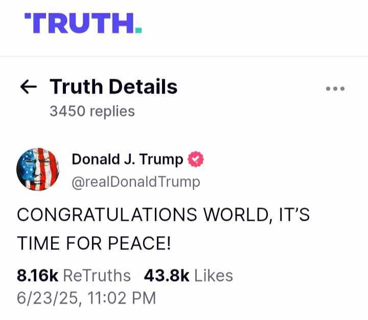 Breaking News കഴിഞ്ഞ പത്തു ദിവസമായി തുടരുന്ന ഇറാന് ഇസ്രായില് സംഘര്ഷം അവസാനിക്കുന്നു; ഇസ്രായേലും ഇറാനും തമ്മിൽ സമഗ്രവും പൂർണ്ണവുമായ വെടിനിർത്തൽ അംഗീകരിച്ഛതായി. ട്രംപ് പ്രഖ്യാപിച്ചു. ലോകത്തിന് അഭിനന്ദനങ്ങൾ. ഇത് സമാധാനത്തിനുള്ള സമയം” എന്ന ഒറ്റവരി പോസ്റ്റ് ആണ് ട്രംപ് തന്റെ സോഷ്യൽ മീഡിയ പ്ലാറ്റ്ഫോമായ ട്രൂത്തിൽ പോസ്റ്റിയത്.