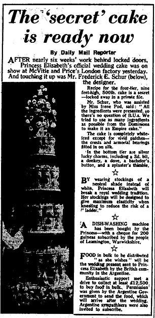 1931 മുതൽ 1969 വരെ ഹോളിറൂഡ്ഹൗസ് കൊട്ടാരത്തിലെ വീട്ടുജോലിക്കാരിയായി രുന്നു മരിയോൺ പോൾസണെന്ന് ലേല സ്ഥാപനമായ റീമാൻ ഡാൻസി പറഞ്ഞു. കേക്കിനൊപ്പം വിവാഹ സമ്മാനത്തിന് നന്ദി പറഞ്ഞുകൊണ്ട് മരിയോണിന് എലിസബത്തിൽ നിന്ന് ഒരു സ്വകാര്യ കത്തും ലഭിച്ചിരുന്നു. എന്നാൽ യഥാർത്ഥ വിവാഹ കേക്ക് ഒമ്പത് അടി ഉയരവും 500 പൗണ്ട് (ഏകദേശം 227 കിലോഗ്രാം) ഭാരവുമുള്ളതായിരുന്നു.