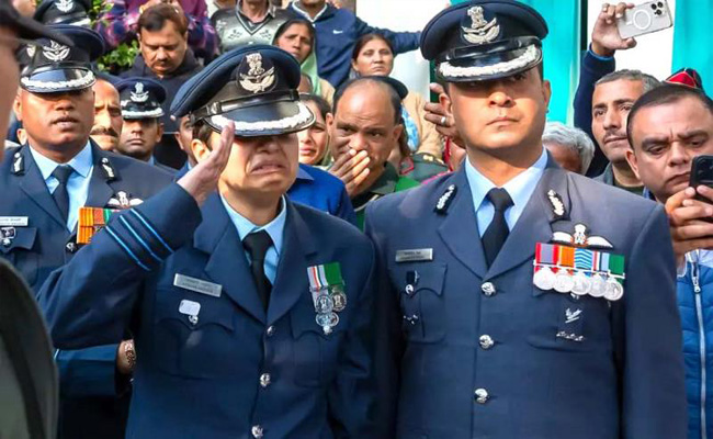 ഷിംല: ദുബായ് എയര് ഷോയിലെ വ്യോമാഭ്യാസത്തിനിടെ തേജസ് യുദ്ധ വിമാനം തകര്ന്ന് മരിച്ച വിങ് കമാന്ഡര് നമാംശ് സ്യാലിന് ഭാര്യയും വ്യോമ സേനാ വിങ് കമാന്ഡറുമായ അഫ്സാന് കണ്ണീരോടെ അന്ത്യാഭിവാദനം നല്കിയത് സംസ്കാര ചടങ്ങിനെത്തിയവരുടെ കണ്ണുകളെയും ഈറനണിയിച്ചു.