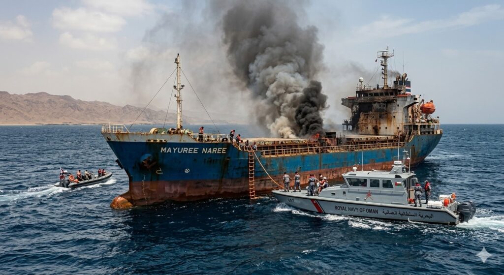 ഒമാൻ തീരത്ത് തായ് ചരക്കുകപ്പലിന് നേരെ ആക്രമണം; എഞ്ചിൻ റൂമിൽ തീപിടുത്തം, 20 പേരെ രക്ഷപ്പെടുത്തി