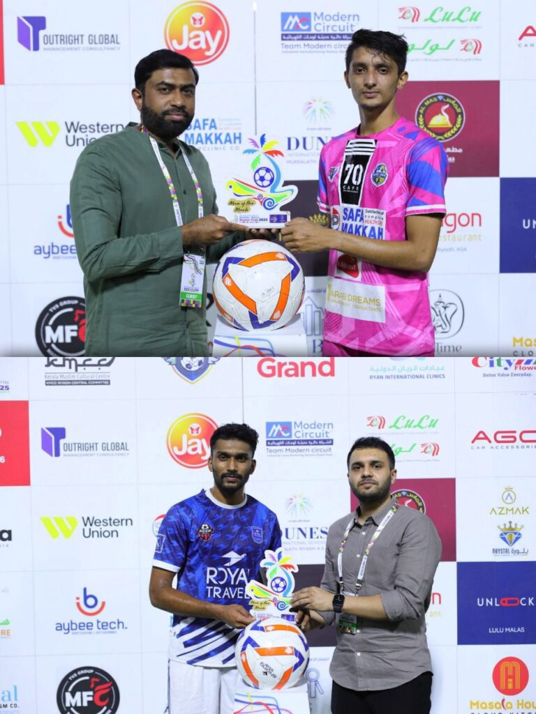 റിയാദ്: ദിറാബിലെ ദുറത് മൽഅബ് സ്റ്റേഡിയത്തിൽ നടക്കുന്ന റിയാദ് കെഎംസിസി സെൻട്രൽ കമ്മിറ്റി ഗ്രാന്റ്-റയാൻ സൂപ്പർ കപ്പിൻ്റെ നാലാം വാരത്തിൽ അസീസിയ സോക്കറിനും, ബ്ലാക്ക് ആൻഡ് വൈറ്റ് റെയിൻബോ എഫ്സിക്കും വിജയം. ഗ്രൂപ്പ് എ യിലെ ആദ്യ രണ്ടു സ്ഥാനക്കാരായ അസീസിയ സോക്കറും റിയൽ കേരള എഫ്സിയും ഏറ്റുമുട്ടിയ ആദ്യ മത്സരത്തിൽ 3 – 1 നാണ് അസീസിയ സോക്കറിന്റെ വിജയം. മത്സരത്തിന്റെ ആദ്യ പകുതിയിൽ ഇരു ടീമുകളും ഓരോ ഗോളടിച്ച് സമനില പാലിച്ചെങ്കിലും രണ്ടാം പകുതിയിൽ ഗ്രൗണ്ടിൽ അസീസിയ സോക്കറിന്റെ വ്യക്തമായ ആധിപത്യം ആണ് കണ്ടത്. അസീസിയക്ക് വേണ്ടി നിയാസ് രണ്ട് ഗോളുകൾ നേടിയപ്പോൾ മുഹമ്മദ് ഒരു ഗോൾ നേടി. നജീബാണ് റിയൽ കേരളയുടെ ആശ്വാസ ഗോൾ നേടിയത്. ഇതോടെ ഗ്രൂപ്പിൽ ആറ് പോയിന്റുമായി അസീസിയ സോക്കർ സെമിയിലേക്ക് മുന്നേറി. അസീസിയ സോക്കറിന്റെ നിയാസ് കളിയിലെ മാൻ ഓഫ് ദി മാച്ച് അവാർഡിന് അർഹനായി. തർഫിൻ ബഷീർ പാരഗൺ അവാർഡ് കൈമാറി