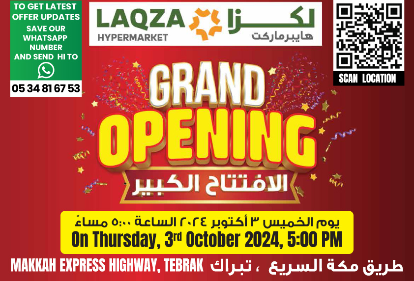 ഉത്ഘാടന ഓഫര് പത്തുദിവസം നീണ്ടു നില്ക്കും റിയാദിലെയും തബ്റാക്കിലെയും പരിസര പ്രദേശങ്ങളിലെയും ഉപഭോക്താക്കള്ക്ക് കുറഞ്ഞ വിലയില് സാധനങ്ങള് ലഭ്യമാക്കുക എന്ന ലക്ഷ്യത്തോടെയാണ് ലക്സ ഹൈപ്പർ മാർക്കറ്റ് പ്രവര്ത്തിക്കുന്നത് ഒക്ടോബർ 3 വ്യാഴം വൈകുന്നേരം 5 മണി മുതല് പ്രവര്ത്തനം ആരംഭിക്കും.