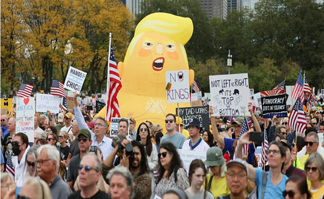 രാജ്യം സ്വേച്ഛാധിപത്യത്തിലേക്ക് വഴുതിവീഴുന്നു, യുഎസില് രാജാക്കന്മാര് ഉണ്ടാകരുത് ഉള്പ്പെടെയുള്ള മുദ്രാവാക്യമായിരുന്നു പ്രതിഷേധക്കാര് ഉയര്ത്തിയത്. ‘നോ കിങ്സ്’ പ്രതിഷേധത്തില് രാജ്യമെമ്പാടു മായി ഏകദേശം എഴുപത് ലക്ഷത്തോളം പേര് അണിനിരന്നതായാണ് കണക്കുകള്. ആധുനിക യുഎസ് ചരിത്രത്തില് ഒരു പ്രസിഡന്റിനെതിരെ നടന്ന ഏറ്റവും വലിയ ഒറ്റ ദിവസത്തെ പ്രകടനമാണിത് എന്ന് സംഘാടകര് അവകാശപ്പെട്ടു. യുഎസ് സര്ക്കാരിന്റെ അടച്ചുപൂട്ടല് മൂന്നാം ആഴ്ചയിലേക്ക് അടുക്കുമ്പോ ഴാണ് , 50 സംസ്ഥാനങ്ങളിലെയും 2,500-ലധികം നഗരങ്ങളിലും പട്ടണങ്ങളിലും പ്രതിഷേധം ഉയരുന്നത്. ട്രംപ് നടത്തുന്നത് അധികാരം പിടിച്ചടക്കാനുള്ള ശ്രമങ്ങളാണെന്നും പ്രതിഷേധക്കാര് ആരോപിച്ചു.