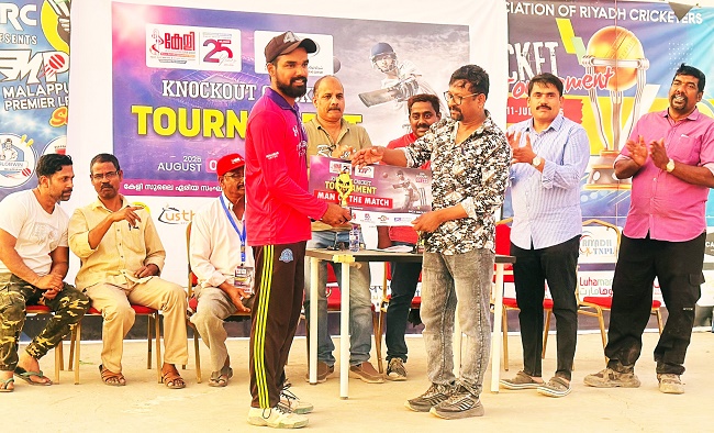 ഫോട്ടോ: ‘മാൻ ഓഫ് ദി മാച്ച്’ ട്രോഫി നന്ദു സംഗീതിന് കേളി സുലൈ ഏരിയ വൈസ് പ്രസിഡന്റ് സുനിൽ കുമാർ കൈമാറുന്നു.