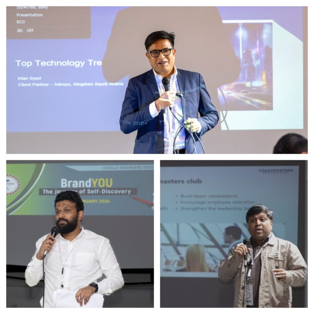 തുടർന്ന് ഇർഫാൻ സയ്യിദ് (‘ഇൻഫോസിസ് ക്ലയന്റ് പാർട്ണർ) സാങ്കേതിക വിദ്യയുടെ ഭാവി പ്രവണതകളെപ്പറ്റി, വിശിഷ്യാ നിർമിത ബുദ്ധിയെയും(Artificial Intelligence) അതിന്റെ വൈവിധ്യമാർന്ന പ്രയോഗതലങ്ങളെ കുറിച്ചും തന്റെ ആഴത്തിലുള്ള അറിവുകൾ പങ്കിട്ടു. ‘ടോസ്റ്റ്മാസ്റ്റേഴ്സ്’ പരിശീലനത്തിലൂടെ പ്രേക്ഷകരെ ആകർഷിക്കു കയും സ്വാധീനിക്കുകയും ചെയ്യുന്ന രീതിയിൽ പ്രസംഗങ്ങൾ നടത്താൻ വ്യക്തികളെ എങ്ങനെ സഹായിക്കുന്നു എന്നു സംവേദനാത്മക സെഷനിലൂടെ എഞ്ചിനീയർ റിയാസ് ഇബ്രാഹിംകുട്ടി വിശദീകരിച്ചു.