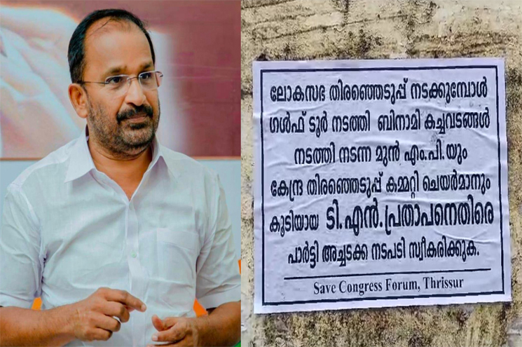 ലോക്‌സഭ തെരഞ്ഞെടുപ്പ് നടക്കുമ്പോള്‍ ഗള്‍ഫ് ടൂര്‍ നടത്തി ബിനാമി കച്ചവടങ്ങള്‍ നടത്തി നടന്ന മുന്‍ എംപിയും കേന്ദ്ര തെരഞ്ഞെടുപ്പ് കമ്മിറ്റി ചെയര്‍മാനും കൂടിയായ ടി എന്‍ പ്രതാപനെതിരെ പാര്‍ട്ടി അച്ചടക്ക നടപടി സ്വീകരിക്കുക എന്നാണ് പോസ്റ്ററില്‍ ആവശ്യപ്പെട്ടിട്ടുള്ളത്. സേവ് കോണ്‍ഗ്രസ് ഫോറം തൃശൂര്‍ എന്ന പേരിലാണ് പോസ്റ്ററുകള്‍.