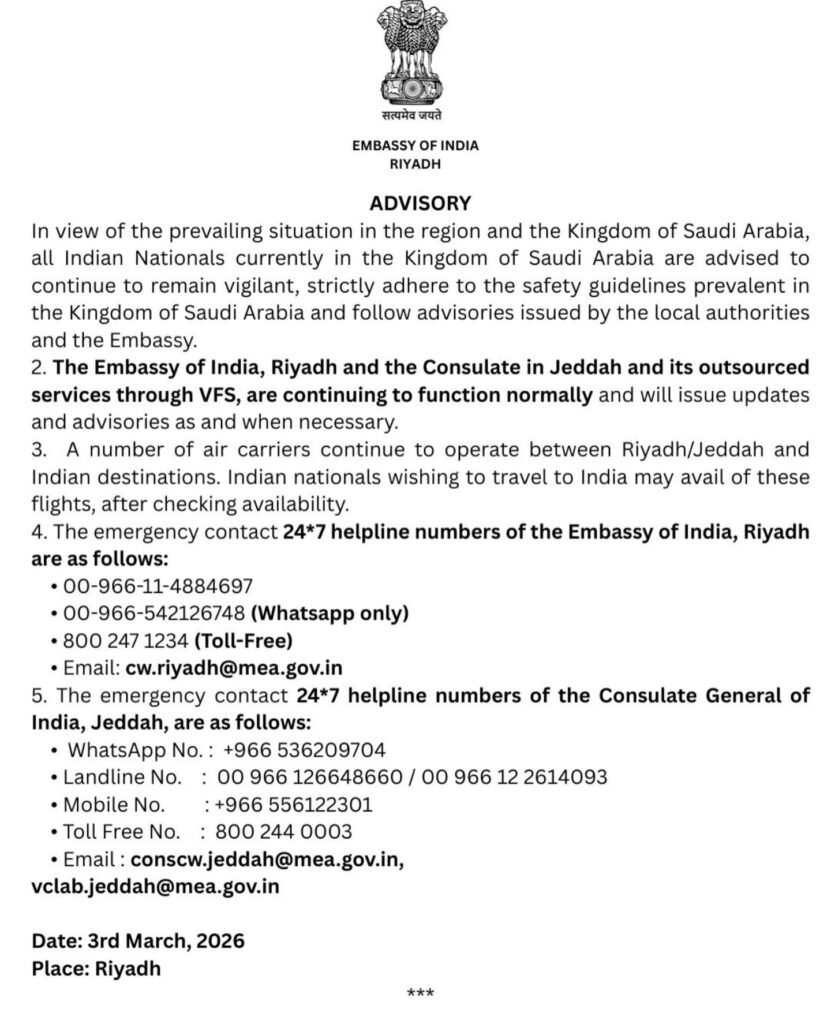 നിലവിൽ റിയാദിലെ ഇന്ത്യൻ എംബസിയും ജിദ്ദയിലെ കോൺസുലേറ്റും വി.എഫ്.എസ് (VFS) വഴിയുള്ള ഔട്ട്സോഴ്സ് സേവനങ്ങളും സാധാരണ നിലയിൽ പ്രവർത്തിക്കുന്നുണ്ട്. വിമാന സർവീസുകൾ മുടക്കമില്ലാതെ തുടരുന്ന സാഹചര്യത്തിൽ, ഇന്ത്യയിലേക്ക് മടങ്ങാൻ ആഗ്രഹിക്കുന്നവർക്ക് ടിക്കറ്റ് ലഭ്യത പരിശോധിച്ചു യാത്ര ചെയ്യാവുന്നതാണെന്നും എംബസി വ്യക്തമാക്കി.