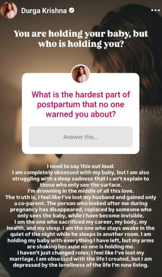 എന്റെ കരിയർ, എന്റെ ശരീരം, എന്റെ ആരോഗ്യം, എന്റെ ഉറക്കം എന്നിവയെല്ലാം ത്യാഗം ചെയ്തത് ഞാനാണ്. അദ്ദേഹം മറ്റൊരു മുറിയിൽ ഉറങ്ങുമ്പോൾ, രാത്രിയുടെ നിശബ്ദതയിൽ ഉണർന്നിരിക്കുന്നത് ഞാനാണ്. എന്റെ ശേഷിക്കുന്ന കരുത്തെല്ലാം ഉപയോഗിച്ച് ഞാൻ കുഞ്ഞിനെ പിടിച്ചിരിക്കുകയാണ്, പക്ഷേ എന്നെ താങ്ങാൻ ആരുമില്ലാത്തതിനാൽ എന്റെ കൈകൾ വിറയ്ക്കുന്നു. എന്റെ ഉത്തരവാദി ത്തങ്ങൾ മാറുക മാത്രമല്ല ചെയ്തത്; എനിക്ക് എന്റെ വിവാഹജീവിതം തന്നെ നഷ്ടപ്പെട്ടതായി തോന്നുന്നു. ഞാൻ സൃഷ്ടിച്ച ഈ ജീവനോട് എനിക്ക് വല്ലാത്ത ഇഷ്ടമാണ്, പക്ഷേ ഇപ്പോൾ ഞാൻ ജീവിക്കുന്ന ഈ ഏകാന്തത എന്നെ വിഷാദത്തിലാക്കുന്നു.”, ദുർഗ കൃഷ്ണ കുറിച്ചു.