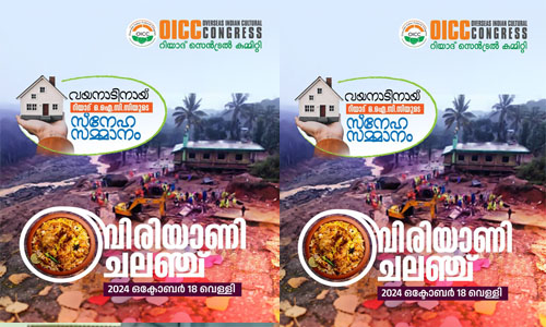ഉരുളെടുത്ത വയനാടിന് വേണ്ടി; കരുതലിന്റെ കരുത്തും കാരുണ്യത്തിന്‍റെ കരങ്ങളും ഒരുക്കി ഒഐസിസി റിയാദ് സെൻട്രൽ കമ്മറ്റി ബിരിയാണി ചലഞ്ച് ഒക്ടോബർ 18 ന്