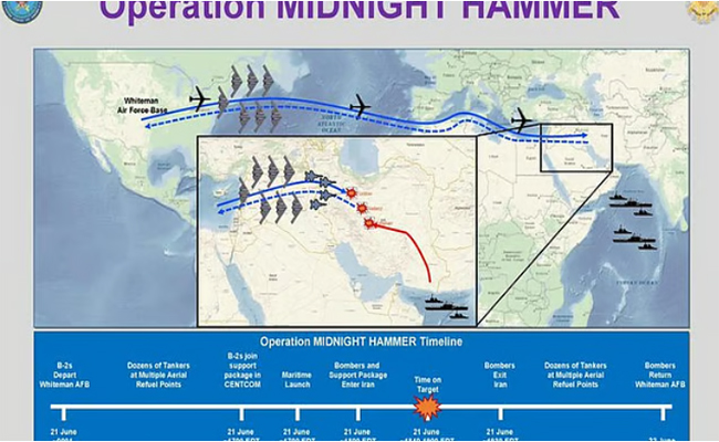 ഇറാനില് പ്രവേശിക്കുന്നതിന് തൊട്ടുമുമ്പായി യുഎസ് അന്തര്വാഹിനിയില്നിന്ന് രണ്ട് ഡസനോളം മിസൈലുകള് ലക്ഷ്യസ്ഥാനത്തിന് നേരെ വിക്ഷേപിച്ചു. തുടര്ന്ന് ഓപ്പറേഷന് ഹാമ്മര് ഇറാന് വ്യോമാതി ര്ത്തി കടന്ന് ലക്ഷ്യസ്ഥാനത്തേക്ക് നീങ്ങുകയായിരുന്നു. അതിവേഗത്തില്, ശത്രുക്കളുടെ മിസൈലുക ളെ വെട്ടിച്ചു നീങ്ങാന് പാകത്തിലുള്ള അത്യാധുനിക എയര്ക്രാഫ്റ്റുകളായിരുന്നു ഉപയോഗിച്ചതെന്നും അമേരിക്ക വ്യക്തമാക്കി.
