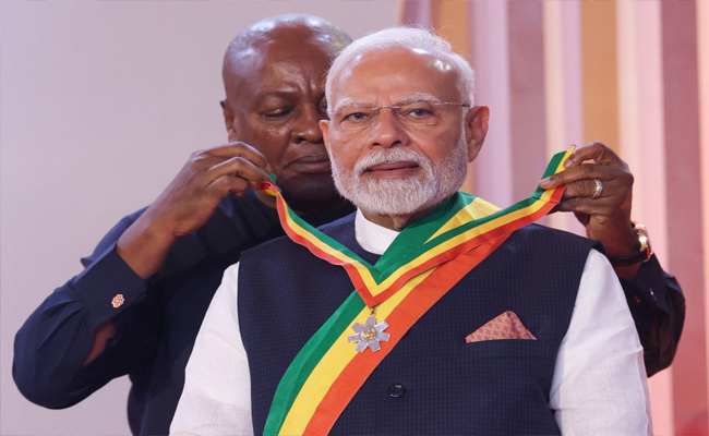 ന്യൂഡല്ഹി: പ്രധാനമന്ത്രി നരേന്ദ്ര മോദിക്ക് ഘാനയുടെ പരമോന്നത സിവിലിയൻ ബഹുമതിയായ ഓഫിസർ ഓഫ് ദി ഓർഡർ ഓഫ് ദി സ്റ്റാർ ഓഫ് ഘാന പുരസ്കാരം സമ്മാനിച്ചു. ഇന്ത്യ-ഘാന നയതന്ത്ര ബന്ധം ശക്തിപ്പെടുത്തുന്നതിൽ മോദിയുടെ സംഭാവനകളെ അംഗീകരിച്ചാണ് ഈ പുരസ്കാരം ഘാന സർക്കാർ നൽകിയത്. ഘാന പ്രസിഡന്റ് ജോൺ ഡ്രാമണി മഹാമയിൽ നിന്നാണ് മോദി അവാർഡ് സ്വീകരിച്ചത്.