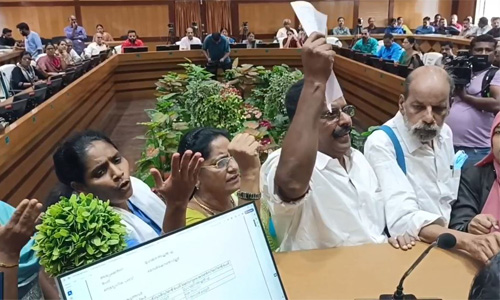 തിങ്കളാഴ്ച രാവിലെ11 മണിയോടെയാണ് ജില്ലാ പഞ്ചായത്ത് ഭരണസമിതി യോഗം തുടങ്ങിയത്. എഡിഎം കെ നവീന് ബാബുവിന്റെ മരണത്തില് അനുശോചിച്ച് മൗനം ആചരിച്ചാണ് യോഗം ആരംഭിച്ചത്. ഉടന് തന്നെ പ്രതിപക്ഷം അടിയന്തരപ്രമേയത്തിന് നോട്ടിസ് നല്കി. 7 ദിവസത്തിനു മുന്പ് നോട്ടിസ് നല്കണമെന്ന് ചൂണ്ടിക്കാട്ടി അടിയന്തര പ്രമേയത്തിന് അനുമതി നിഷേധിച്ചു. വൈസ് പ്രസിഡന്റ് വിനോയ് കുര്യനായിരുന്നു അധ്യക്ഷന്. 7 യുഡിഎഫ് അംഗങ്ങള് ഇതിനെതിരെ പ്രതിഷേധിച്ചു. നടുത്തളത്തിലിറങ്ങി മുദ്രാവാക്യം വിളിച്ചു.