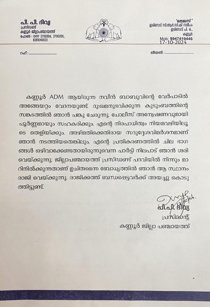 കണ്ണൂര് എഡിഎം ആയിരുന്ന നവീന് ബാബുവിന്റെ വേര്പാടില് അങ്ങേയറ്റം വേദനയുണ്ട്. ദുഃഖമനുഭവിക്കുന്ന കുടുംബത്തിന്റെ സങ്കടത്തില് ഞാന് പങ്കു ചേരുന്നു. പൊലീസ് അന്വേഷണവുമായി പൂര്ണമായും സഹകരിക്കും. എന്റെ നിരപരാധിത്വം നിയമവഴിയിലൂടെ തെളിയിക്കും. അഴിമതിക്കെതിരായ സദുദ്ദേശ വിമര്ശനമാണ് ഞാന് നടത്തിയതെങ്കിലും എന്റെ പ്രതികരണത്തില് ചില ഭാഗങ്ങള് ഒവിവാക്കേണ്ട തായിരുന്നുവെന്ന പാര്ട്ടി നിലപാട് ഞാന് ശരി വയ്ക്കുന്നു. ജില്ലാ പഞ്ചായത്ത് പ്രസിഡന്റ് പദവിയില് നിന്നു മാറി നില്ക്കുന്നതാണ് ഉചിതമെന്ന ബോധ്യത്തില് ഞാന് സ്ഥാനം രാജി വയ്ക്കുന്നു. രാജി ബന്ധപ്പെട്ടവര്ക്ക് അയച്ചു കൊടുത്തിട്ടുണ്ട്.
