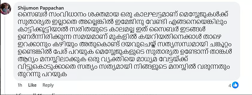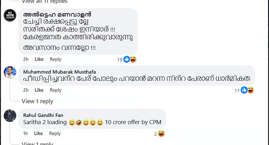 ‘ചങ്കൂറ്റമുണ്ടെങ്കില് പേര് വെളിപ്പെടുത്തുക അയച്ച മെസ്സേജുകളുടെ ഡീറ്റെയില് മാധ്യമപ്രവര്ത്തകരെ കാണിക്കുക മെസ്സേജുകള്ക്ക് സുതാര്യത ഉണ്ടോ എന്ന് മാധ്യമപ്രവര്ത്തകര് അന്വേഷിക്കണം. പുകമറ സൃഷ്ടിച്ച ഒരു വ്യക്തിയെ തേജോവധം ചെയ്യാന് മറ്റൊരു സരിതയായി മാറരുത്. ദയവു ചെയ്തു മെസ്സേ ജുകള് സുതാര്യത ഇല്ലെങ്കില് വലിയ കേസിലേക്ക് താങ്കള് വലിച്ചിഴയ്ക്കപ്പെടും’. ‘സന്ദേശം സിനിമയ്ക്ക് രണ്ടാം ഭാഗത്തിന്റെ ആവശ്യമില്ല….. കാരണം ആ സിനിമ അന്ന് പറഞ്ഞു വെച്ചതില് നിന്നും ഒരിഞ്ച് കേരള രാഷ്ട്രീയം മുന്നോട്ട് പോയിട്ടില്ല’ എന്നൊക്കെയാണ് കമന്റുകള്.
