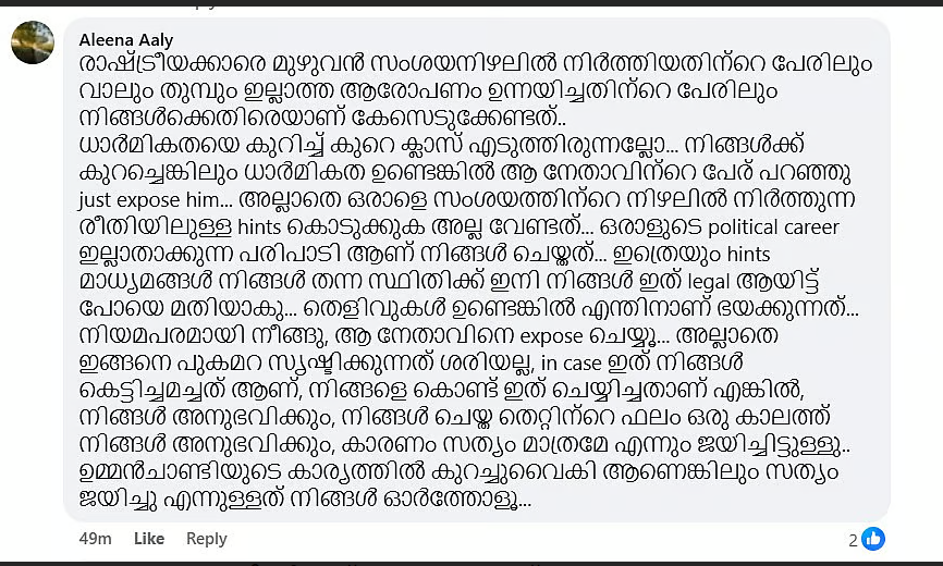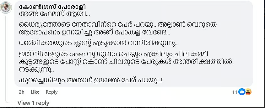 cyber attack’ധൈര്യത്തോടെ നേതാവിന്റെ പേര് പറയു.. അല്ലാണ്ട് വെറുതെ ആരോപണം ഉന്നയിച്ചു അങ്ങ് പോകല്ല വേണ്ടേ… ധാര്മികതയുടെ ക്ലാസ്സ് എടുക്കാന് വന്നിരിക്കുന്നു.. ഇത് നിങ്ങളുടെ കരിയറിന് ഗുണം ചെയ്യുമെങ്കിലും ചില കമ്മി കൂട്ടങ്ങളുടെ പോസ്റ്റ് കൊണ്ട് ചിലരുടെ പേരുകള് അന്തരീക്ഷത്തില് നടക്കുന്നു… കുറച്ചെങ്കിലും അന്തസ് ഉണ്ടേല് പേര് പറയു…!’ എന്നാണ് കോണ്ഗ്രസ് പോരാളി എന്ന ഫെയ്സ്ബുക്ക് യൂസര് റിനിയുടെ ഫോട്ടോയ്ക്ക് താഴെ കമന്റിട്ടത്.