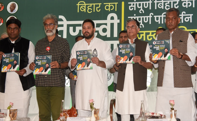 പട്ന: ബിഹാര് നിയമസഭ തെരഞ്ഞെടുപ്പുമായി ബന്ധപ്പെട്ട് പ്രകടന പത്രിക പുറത്തിറക്കി. പ്രതിപക്ഷത്തിൻ്റെ മുഖ്യമന്ത്രി സ്ഥാനാര്ഥിയും രാഷ്ട്രീയ ജനതാദൾ (ആർജെഡി) നേതാവുമായ തേജസ്വി യാദവും ഇന്ത്യൻ മഹാ സഖ്യത്തിലെ (മഹാഗത്ബന്ധൻ) നേതാക്കളും ചേര്ന്നാണ് പ്രകടനപത്രിക പുറത്തിറക്കിയത്. ‘ബിഹാർ കാ തേജസ്വി പ്രാൺ’ എന്ന് പത്രികയ്ക്ക് നാമകരണം ചെയ്തു.