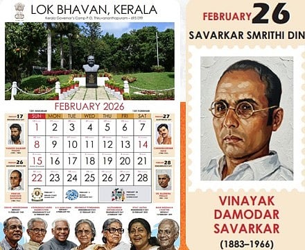 തിരുവനന്തപുരം: ലോക്ഭവന് പുറത്തിറക്കിയ കലണ്ടറില് പ്രമുഖ വ്യക്തികളുടെ കൂട്ടത്തില് ഹിന്ദു മഹാസഭ നേതാവ് വി.ഡി.സവര്ക്കറുടെ ചിത്രവും. 2026ലെ കലണ്ടറിലെ ഫെബ്രുവരി മാസം സൂചിപ്പി ക്കുന്ന പേജിലാണ് സവര്ക്കറുടെ ചിത്രമുള്ളത്. ചന്ദ്രശേഖര് ആസാദിന്റെയും, ഡോ.രാജേന്ദ്രപ്രസാദി ന്റെയും ചിത്രങ്ങളും ഒപ്പമുണ്ട്. കെ ആര് നാരായണന്റെ ചിത്രമാണ് ഫെബ്രുവരി പേജിലെ പ്രധാന ചിത്രം.
