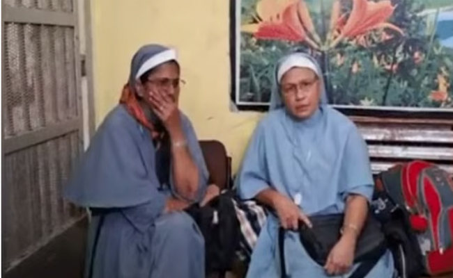 അതേസമയം മലയാളി കന്യാസ്ത്രീകളെ കുടുക്കുകയായിരുന്നുവെന്ന് കുടുംബം ആരോപിച്ചു. തുടക്കത്തില്‍ മതപരിവര്‍ത്തനമാണ് ആരോപിച്ചിരുന്നതെങ്കില്‍ പിന്നീട് മനുഷ്യക്കടത്ത് കുറ്റം കൂടി ഉള്‍പ്പെടുത്തുകയായിരുന്നുവെന്ന് കുടുംബക്കാര്‍ പറയുന്നു. അസീസി സിസ്റ്റേഴ്‌സ് ഓഫ് മേരി ഇമ്മാക്കു ലേറ്റ് സന്യാസിനി സമൂഹത്തില്‍ ഉള്‍പ്പെട്ടവരാണ് ഇരു കന്യാസ്ത്രീമാരും. 20 വര്‍ഷത്തിലധിക മായി സിസ്റ്റര്‍ മേരി പ്രീതി ഉത്തരേന്ത്യയില്‍ നഴ്‌സ് ആയി സേവനമനുഷ്ഠിക്കുകയാണെന്നും കുടുംബം പറഞ്ഞു. രണ്ടു മാസം മുന്‍പാണ് നാട്ടില്‍ വന്നു പോയത്. സ്ഥിതിഗതികള്‍ മോശമാണെന്നും പുറത്തിറ ങ്ങാന്‍ പോലും കഴിയാത്ത സാഹചര്യമുണ്ടെന്നും സിസ്റ്റര്‍ പ്രീതി പറഞ്ഞിരുന്നതായും കുടുംബം പറയുന്നു. മൂന്നു പെണ്‍കുട്ടികളും പ്രായപൂര്‍ത്തിയായവരും, മാതാപിതാക്കളുടെ സമ്മതത്തോടെ ജോലിക്കായി പോന്നവരുമാണ്. പെണ്‍കുട്ടികളുടെ കുടുംബവും റെയില്‍വേ സ്റ്റേഷനില്‍ ഉണ്ടായിരുന്നു. എല്ലാ രേഖകളും പൊലീസിനെ കാണിച്ചിട്ടും അറസ്റ്റ് ചെയ്യുകയായിരുന്നുവെന്നും ബന്ധുക്കള്‍ പറയുന്നു.