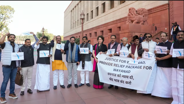 വയനാടിനു നീതി നല്കുക, ദുരിതാശ്വാസ പാക്കേജ് അനുവദിക്കുക എന്നെഴുതിയ ബാനര് ഉയര്ത്തി മകര്ദ്വാറിനു മുന്നില് എംപിമാര് നിലയുറപ്പിച്ചു. പ്രിയങ്ക ഗാന്ധി ഉള്പ്പെടെയുള്ള എംപിമാര് മലയാളത്തില് മുദ്രാവാക്യം വിളിച്ച് പ്രതിഷേധത്തില് പങ്കു ചേര്ന്നു.