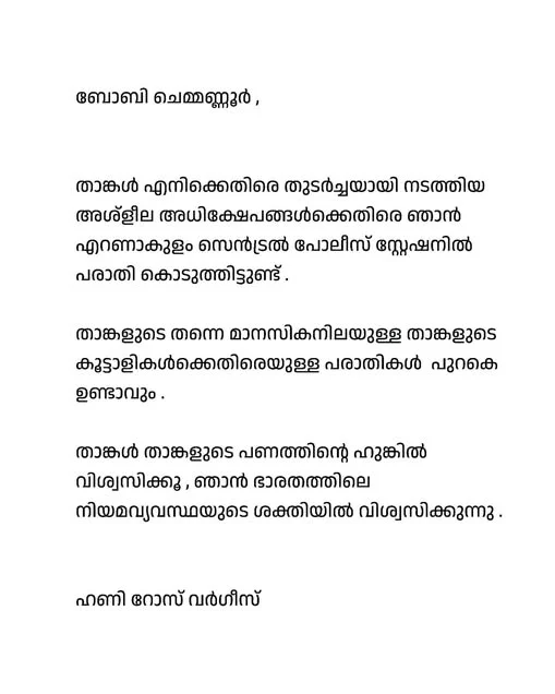 താങ്കളുടെ തന്നെ മാനസിക നിലയുള്ള താങ്കളുടെ കൂട്ടാളികള്ക്കെതിരെ പരാതികള് പിന്നാലെ നല്കുമെന്ന് ഹണി റോസ് പറഞ്ഞു. താങ്കള് താങ്കളുടെ പണത്തിന്റെ ഹൂങ്കില് വിശ്വസിക്കുമ്പോള് താന് ഭാരതത്തിലെ നിയമവ്യവസ്ഥയുടെ ശക്തയില് വിശ്വസിക്കുന്നുവെന്ന് നടി പറഞ്ഞു.