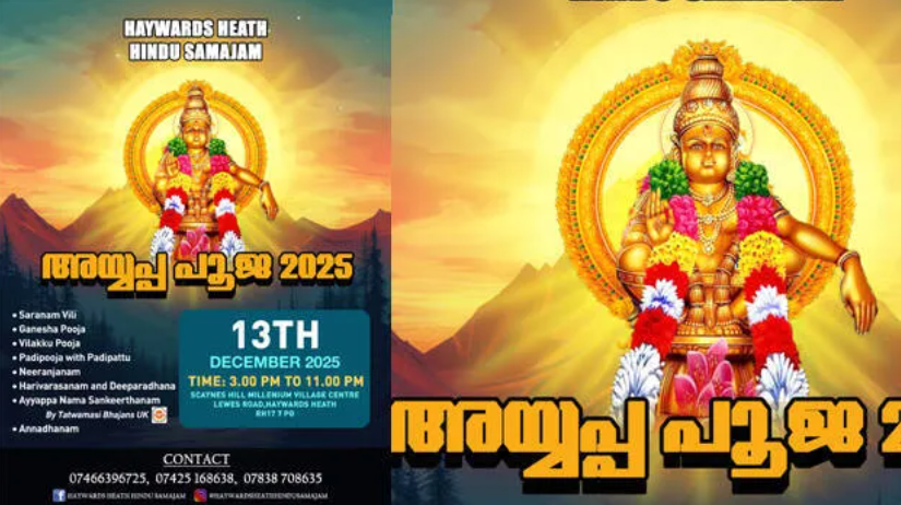 ലണ്ടൻ: ഇംഗ്ലണ്ടിലെ ഹേവാർഡ്സ് ഹീത്ത് ഹിന്ദു സമാജത്തിന്റെ പതിനെട്ടാം വർഷ അയ്യപ്പ പൂജ 2025 ഡിസംബർ 13 ശനിയാഴ്ച നടത്തും. വെെകിട്ട് മൂന്ന് മണിമുതൽ 11 മണിവരെ ഹേവാർഡ്സ് ഹീത്തിലുള്ള സ്കെയ്ൻസ് ഹിൽ മില്ലെനിയും വില്ലേജ് സെന്റെറിൽ വച്ച് വിപുലമായ രീതിയിലാണ് നടത്താൻ ഉദ്ദേശിക്കുന്നത്.