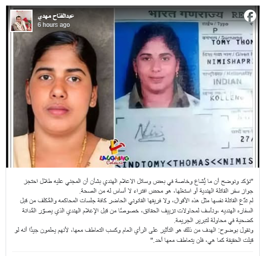 തലാല് നിമിഷയുടെ പാസ്പോര്ട്ട് കണ്ടുകെട്ടിയെന്നും അവരെ ചൂഷണം ചെയ്തെന്നുമുള്ള കിംവദന്തി കള് പ്രചരിപ്പിക്കുകയാണ്. ഇത്തരം ആരോപണങ്ങള് ശരിയല്ല. കുറ്റകൃത്യത്തെ ന്യായീകരിക്കാന് ഇത്തരം ആക്ഷേപങ്ങള് ഉന്നയിക്കുകയാണ്. കുറ്റവാളിയെ ഇരയായി ചിത്രീകരിക്കാനാണ് ഇപ്പോഴത്തെ ശ്രമങ്ങൾ. സഹതാപം നേടി പൊതുജന പിന്തുണ നേടാന് ശ്രമിക്കുകയാണ് എന്നും അബ്ദുല് ഫത്താഹ് മഹ്ദി പറയുന്നു.