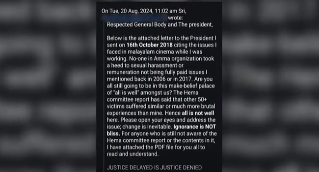 കതകില് മുട്ടിയപ്പോള് തുറക്കാത്തതുമൂലം ആ സിനിമയുടെ സംവിധായകന് പ്രതികാരബുദ്ധിയോടെയാണ് സെറ്റില് തന്നോട് പെരുമാറിയത്. സീനുകള് വിശദീകരിച്ചു നല്കാനോ, മുഖത്തു നോക്കാനോ പോലും കൂട്ടാക്കിയില്ല എന്നും നടി പരാതിയില് ചൂണ്ടിക്കാട്ടിയിട്ടുണ്ട്. ഹേമ കമ്മിറ്റി റിപ്പോര്ട്ട് പുറത്തു വന്നതിന് പിന്നാലെ, നടി ഈ മാസം 20 ന് താന് മുമ്പു നല്കിയ പരാതിയുടെ കാര്യം ഒര്മ്മിപ്പിച്ച് വീണ്ടും കുറിപ്പു നല്കി. ശക്തരായ നടീനടന്മാര്ക്ക് വേണ്ടി മാത്രമാണോ അമ്മ സംഘടന നിലകൊള്ളുന്നതെന്നും പരാതിയില് നടി ചോദിക്കുന്നു.