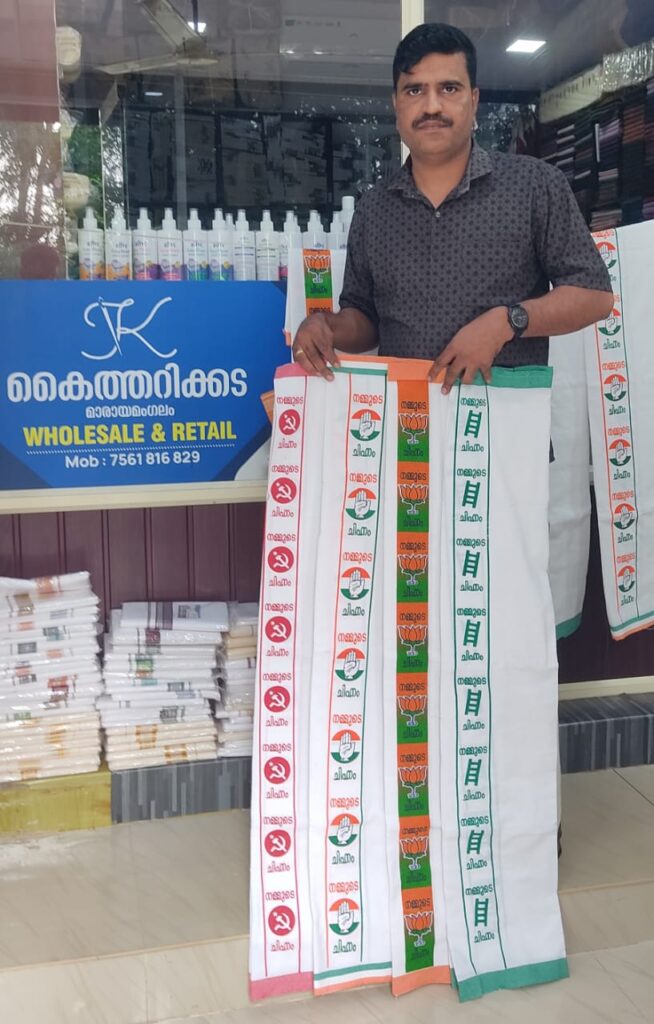 പാലക്കാട്: തെരഞ്ഞെടുപ്പ് പ്രഖ്യാപിച്ചതോടെ സ്ഥാനാർഥികൾ മാത്രമല്ല, മാരായമംഗലത്തെ ഗിരീഷി ൻ്റെ കൈത്തറി കടയും വൈറലാണ്. പാർട്ടി ചിഹ്നങ്ങൾ കരയാക്കി ഒറ്റമുണ്ടുകൾ വിൽപനക്കെത്തിച്ച തോടെ സംഗതി ക്ലിക്കായി. സിപിഐ, കോൺഗ്രസ്, ബിജെപി, മുസ്ലിം ലീഗ് ചിഹ്നങ്ങളായ അരിവാൾ ചുറ്റിക നക്ഷത്രം, അരിവാൾ നെൽക്കതിർ, കൈപ്പത്തി, താമര, ഏണി എന്നീ ചിത്രങ്ങൾ പതിച്ച മുണ്ടാണ് പരീക്ഷണാടിസ്ഥാനത്തിൽ ഇറക്കിയത്. ഇതാകട്ടെ പാർട്ടി പ്രവർത്തകരും സ്ഥാനാർഥികളും ഇരുകൈ യും നീട്ടി സ്വീകരിക്കുകയായിരുന്നുവെന്ന് ഗിരീഷ് പറഞ്ഞു.