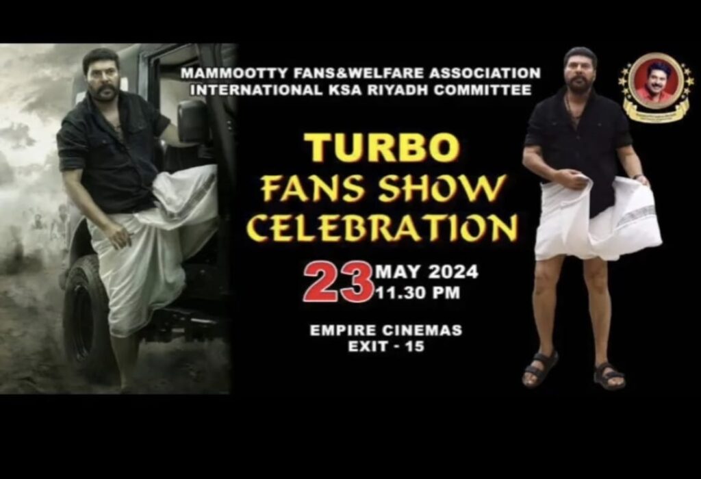 റിയാദ്: മെഗാസ്റ്റാർ മമ്മൂട്ടിയുടെ പുതിയ ചിത്രമായ ടർബോ യ്ക്ക് സൗദി അറേബ്യ യിലും വൻ വരവേൽപ്പ്. കഴിഞ്ഞ ദിവസം റിലീസ് ചെയ്ത ചിത്രത്തിന്, മമ്മൂട്ടി ഫാൻസ് & വെൽഫെയർ അസോസിയേഷൻ ഇന്റർനാഷണൽ (MFWAI) സൗദി അറേബ്യ ചാപ്റ്ററി ന്റെ നേതൃത്വത്തിൽ റിയാദ്, ജിദ്ദ, ദമ്മാം എന്നീ ഏരിയ കമ്മറ്റിയുടെ നേതൃത്വത്തിൽ ഫാൻസ് ഷോയും വിജയാഘോഷവും സംഘടിപ്പിച്ചു.