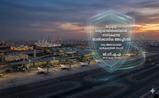 അബുദാബി: മേഖലയിലെ സുരക്ഷാ സാഹചര്യങ്ങൾ കണക്കിലെടുത്ത് രാജ്യത്തിന്റെ വ്യോമാതിർ ത്തിയിൽ ഭാഗികമായി താൽക്കാലിക നിയന്ത്രണങ്ങൾ ഏർപ്പെടുത്തിയതായി യുഎഇ ജനറൽ സിവിൽ ഏവിയേഷൻ അതോറിറ്റി (GCAA) അറിയിച്ചു. ഇതൊരു അസാധാരണ മുൻകരുതൽ നടപടി ആണെന്ന് അതോറിറ്റി വ്യക്തമാക്കി.