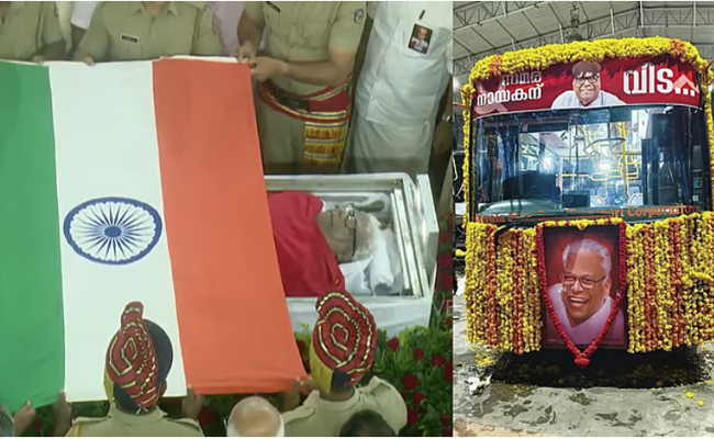പാളയം, പിഎംജി, പ്ലാമൂട്, പട്ടം, കേശവദാസപുരം, ഉള്ളൂര്, പോങ്ങുംമൂട്, ശ്രീകാര്യം, ചാവടിമുക്ക്, പാങ്ങപ്പാറ, കാര്യവട്ടം, കഴക്കൂട്ടം, വെട്ടുറോഡ്, കണിയാപുരം, പള്ളിപ്പുറം, മംഗലപുരം, ചെമ്പകമംഗലം, കോരാണി, മൂന്നുമുക്ക്, ആറ്റിങ്ങല്, കച്ചേരിനട, ആലംകോട്, കടുവയില്, കല്ലമ്പലം, നാവായിക്കുളം, 28-ാം മൈല്, കടമ്പാട്ടുകോണം, പാരിപ്പള്ളി, ചാത്തന്നൂര്, കൊട്ടിയം, ചിന്നക്കട ബസ്ബേ, കാവനാട്, ചവറ, കരുനാഗപ്പള്ളി, ഓച്ചിറ, കെപിഎസി ജംഗ്ഷന്, കായംകുളം കെഎസ്ആര്ടിസി, കരിയിലക്കു ളങ്ങര, നങ്ങാര്കുളങ്ങര, ഹരിപ്പാട് കെഎസ്ആര്ടിസി, റാണാപ്പടി, കരുവാറ്റ, തോട്ടപ്പള്ളി, പുറക്കാട്, അമ്പലപ്പുഴ ടൗണ്, വണ്ടാനം മെഡിക്കല് കോളജ് എന്നീ വഴികളിലൂടെയാണ് പുന്നപ്രയിലെ വീട്ടിലെ ത്തിക്കുക. വഴികളില് പൊതുജനങ്ങള്ക്ക് അന്തിമോപചാരം അര്പ്പിക്കാന് ക്രമീകരണം ഏര്പ്പെടുത്തിയിട്ടുണ്ട്.