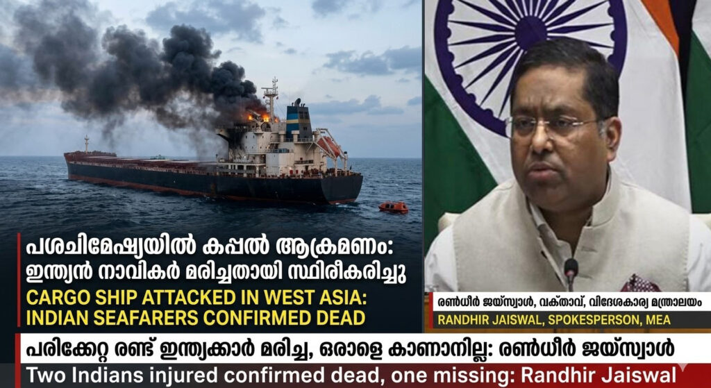 “ചിലർക്ക് പരിക്കേറ്റതായി റിപ്പോർട്ടുകളുണ്ട്. രണ്ട് ഇന്ത്യൻ പൗരന്മാരെ ഞങ്ങൾക്ക് നഷ്ടപ്പെട്ടു, ഒരാളെ കാണാനില്ല. ഈ മൂന്ന് ഇന്ത്യൻ പൗരന്മാരും മരിച്ചു അല്ലെങ്കിൽ കാണാതാവുകയാണ്. ആക്രമണത്തി നിരയായ വ്യാപാര കപ്പലുകളിലായിരുന്നപ്പോഴാണ് ഇത് സംഭവിച്ചത്,” അദ്ദേഹം പറഞ്ഞു.