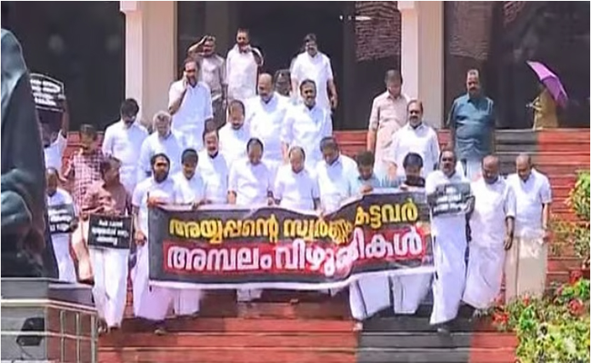 ചോദ്യോത്തരവേള ആരംഭിച്ച് സ്പീക്കര് എ എന് ഷംസീര് ചെയറില് എത്തിയ സമയത്ത് ശബരിമല സ്വര്ണപ്പാളി വിഷയം ഉന്നയിച്ച് പ്രതിഷേധവുമായി പ്രതിപക്ഷം നടുത്തളത്തിലിറങ്ങുകയായിരുന്നു. ഇതോടെ ചോദ്യോത്തരം റദ്ദ് ചെയ്ത് സഭ അല്പ്പസമയത്തേക്ക് നിര്ത്തിവെച്ചതായി സ്പീക്കര് അറിയിച്ചു. തുടര്ച്ചയായ രണ്ടാം ദിവസമാണ് പ്രതിപക്ഷ ബഹളത്തെത്തുടര്ന്ന് സഭാ നടപടികള് നിര്ത്തിവെയ്ക്കു ന്നത്. ‘സ്വര്ണ്ണം കട്ടത് ദേവസ്വം ബോര്ഡിന്റെ അറിവോടെ’, ‘കൊള്ള സംഘം അയ്യപ്പ വിഗ്രഹവും അടിച്ചു മാറ്റും’ എന്നീ പ്ലക്കാര്ഡ് ഉയര്ത്തിയാണ് സഭയില് പ്രതിപക്ഷം മുദ്രാവാക്യം വിളിച്ചത്. സ്പീക്കറിന്റെ മുഖം മറച്ചും പ്രതിപക്ഷം പ്രതിഷേധിച്ചു.